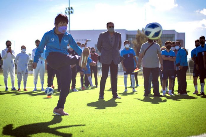Comprometida con el deporte universitario, la Rectora Lilia Cedillo Ramírez inauguró con la tradicional patada de apertura la cancha 5 de fútbol soccer, frente a la Unidad de Seminarios en Ciudad Universitaria, luego de los trabajos de mantenimiento y rehabilitación que se hicieron a este espacio que beneficiará a mil 500 estudiantes.