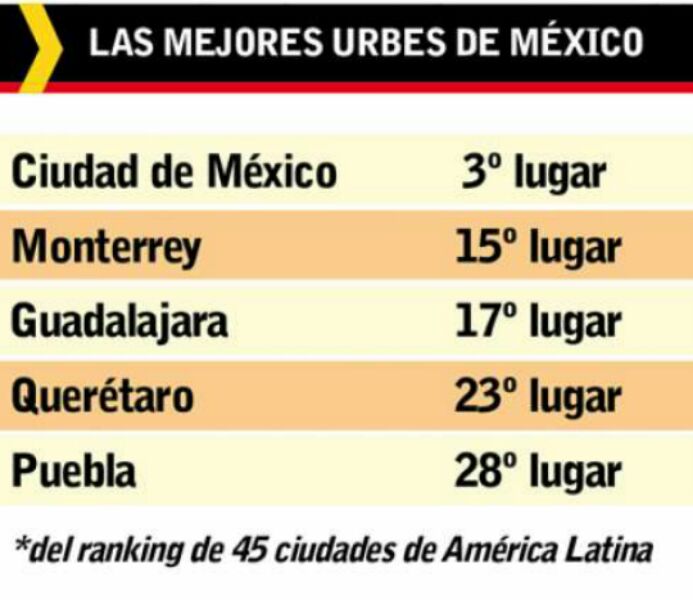 La primera es Ciudad de México que ocupa el tercer lugar en el ranking, y le sigue Monterrey (Nuevo León) que ocupa el puesto 15, Guadalajara (Jalisco) en el 17 y Querétaro en el 23.
