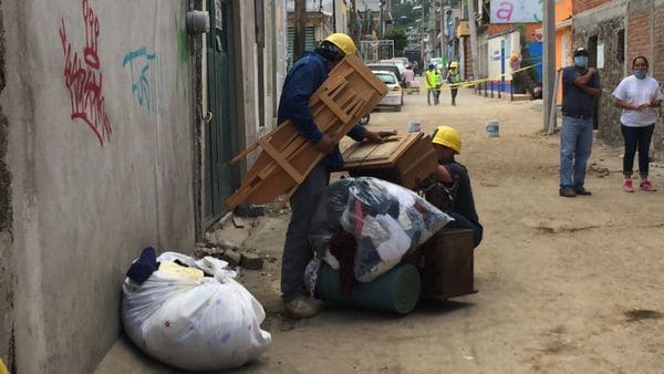 Entre las calles llenas aún de residuos y polvo, continúa el éxodo, el ir y venir de vecinos que intentan salvar lo poco que queda de sus casas, como las hermanas Rosa María y Rocío Páez, quienes pasan al menos 12 horas al día sentadas en una papelería ubicada al lado de lo que era su casa.