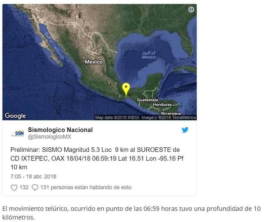 Se trató de un temblor con epicentro al Suroeste de Ciudad Ixtepec, en la región del Istmo de Tehuantepec, informó a través de su cuenta de Twitter el Sismológico Nacional.