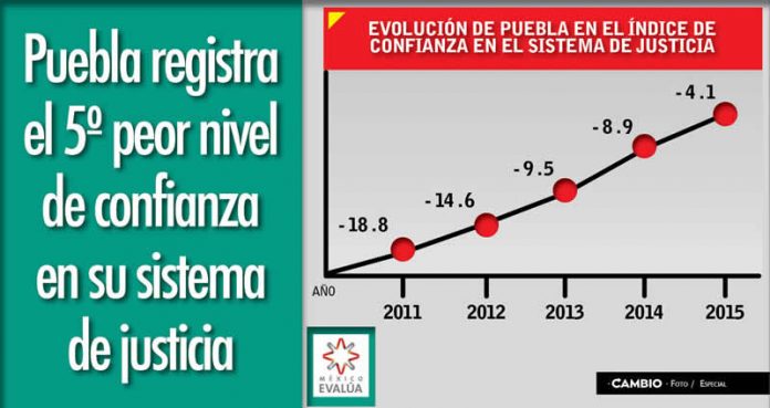 Según el estudio Justicia a la Medida que realizó México Evalúa, los poblanos no confían en las instituciones y por ende no denuncian. En general, las entidades que presentaron los índices más bajos fueron el Distrito Federal (-27.3), el Estado de México (-19.6) y Morelos (-14.7).