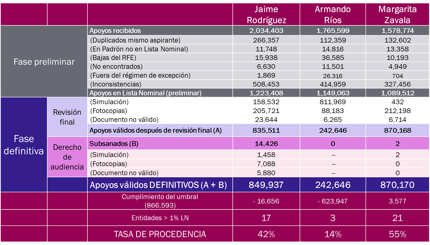 Señalando que sólo tres aspirantes habían presentado una cantidad de apoyos por encima del mínimo establecido, pero sólo Margarita Zavala cumplió cabalmente con los requisitos, por lo que se le otorgó su registro; asimismo, menciona que los otros dos aspirantes –“El Bronco” y Armando Ríos Piter- aunque habían obtenido una gran cantidad de apoyos, varios fueron descartados por diversas irregularidades (personas fallecidas, no registradas para votar, apoyos duplicados, etc.), como lo muestra la tabla siguiente: