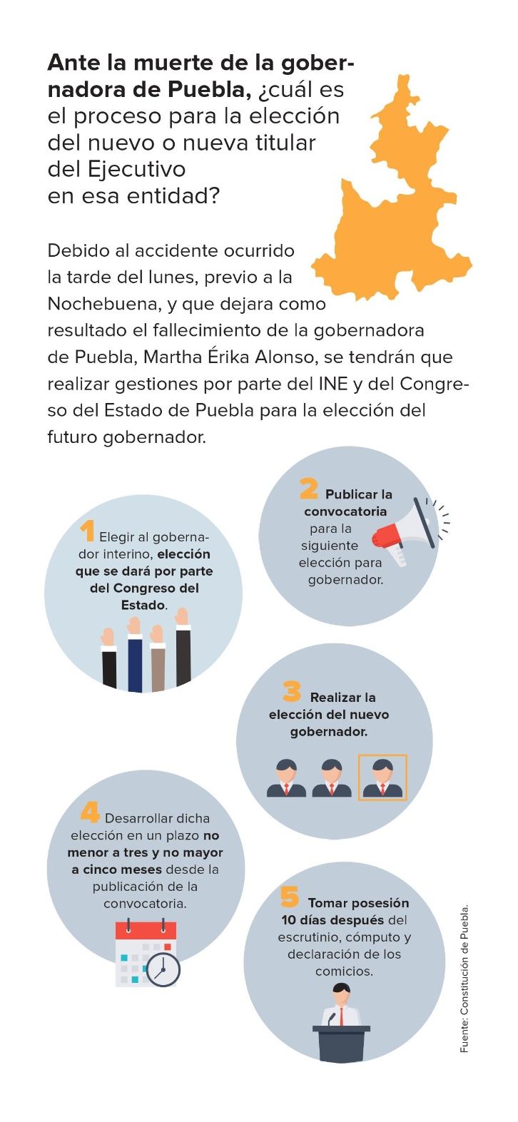 Para el tema, Reynaldo Saldívar, asesor en la Sala Superior del Tribunal Electoral del Poder Judicial de la Federación (TEPJF), comentó vía telefónica con EL DEBATE el proceso de elección y los lineamientos que se deberán llevar a cabo en dicho estado, «de acuerdo con el artículo 57, fracción XVII y XVIII de la Constitución local, el Congreso del Estado deberá elegir con carácter de interino al ciudadano que deba sustituir al gobernador de elección popular directa, en sus faltas temporales o en su falta absoluta, si esta acaeciere en los dos primeros años del periodo constitucional», explicó con bases en la Constitución del estado de Puebla.