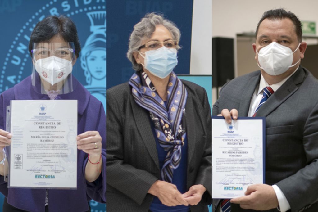 Luego de recibir sus constancias de idoneidad, ante la Comisión Electoral este jueves 2 de septiembre se registraron como candidatos y candidatas a la Rectoría de la BUAP, periodo 2021-2025, los académicos María del Socorro Guadalupe Alicia de la Inmaculada Concepción Grajales y Porras, María Lilia Cedillo Ramírez y Ricardo Paredes Solorio.