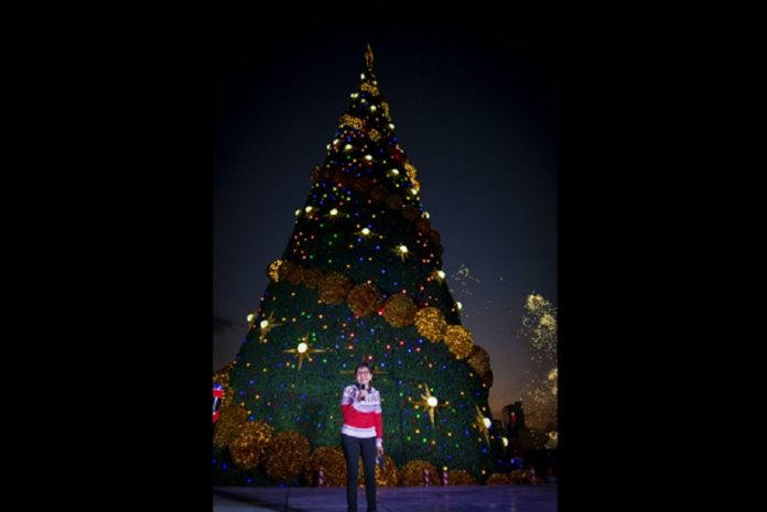 Fuegos pirotécnicos y bengalas rodearon al majestuoso árbol de Navidad de 30 metros de altura, con una estrella de 3 metros en su parte más alta y 2 mil 800 luces led de colores, 5 mil metros de escarcha y 150 esferas doradas, más otras 80 estrellas.