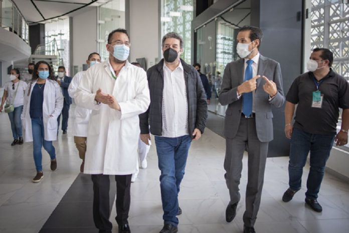 Para garantizar el éxito en la jornada de vacunación para trabajadores del sector educativo, la cual inicia este martes en Puebla, el Rector Alfonso Esparza Ortiz acompañó al subsecretario de Educación Superior, Luciano Concheiro Bórquez y al doctor José David López Borbolla, director de la Clínica 57 del Instituto Mexicano del Seguro Social, en un recorrido por el Centro de Convenciones de Ciudad Universitaria, para supervisar los protocolos de seguridad y logística que faciliten la aplicación de 22 mil 600 dosis del biológico CanSino para la prevención de COVID-19.